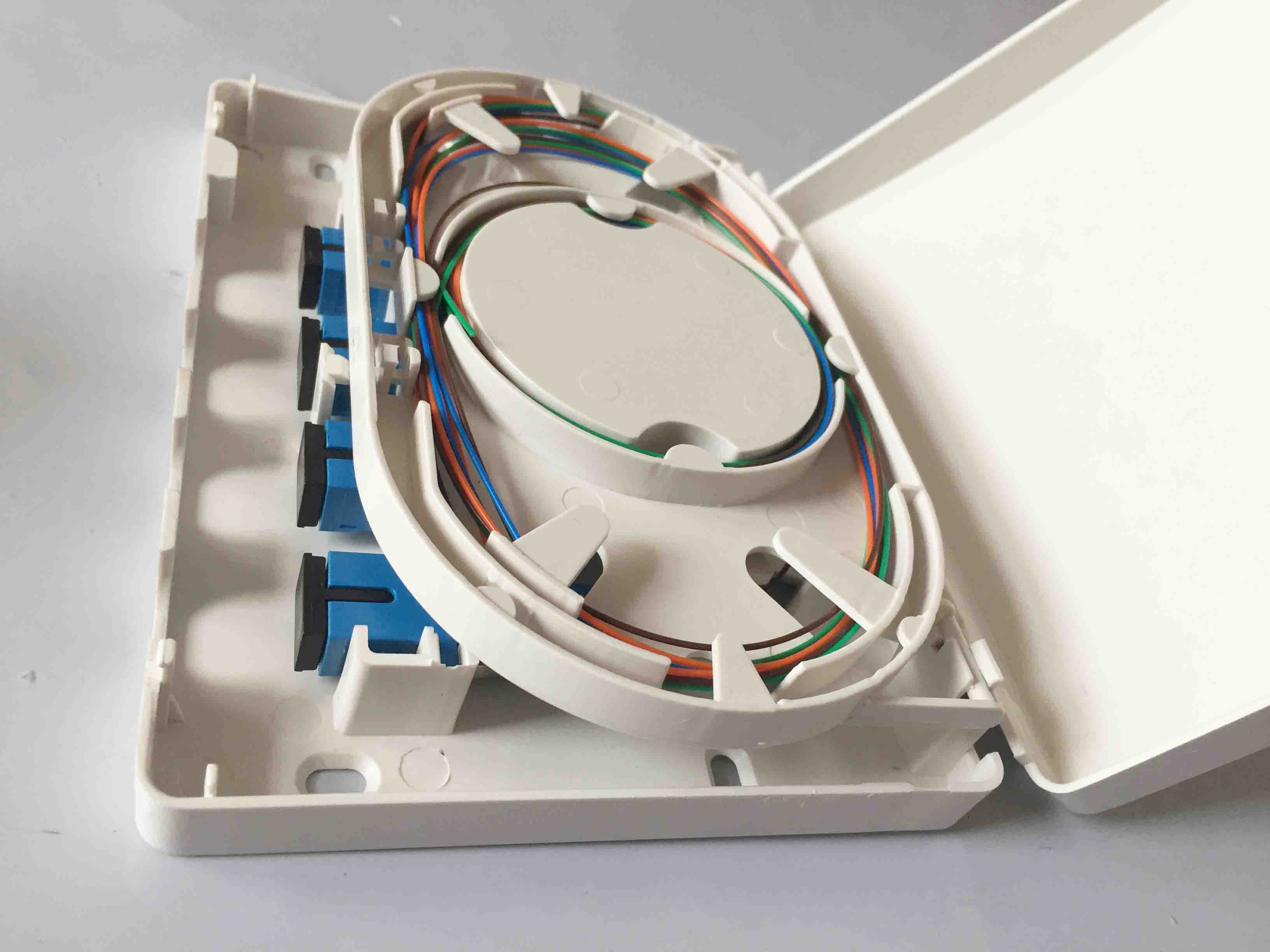 It is FTTH mini optic terminal box , made of high quality plastic, small size, with plastic splice tray inside. It provides an economical way for terminating small optical fiber.